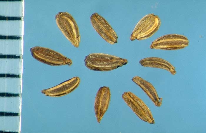 Fruits ovoïdes-oblongs de 2 à 2,5 mm se distinguant de ceux de Ammi majus par les côtes assez peu saillantes.