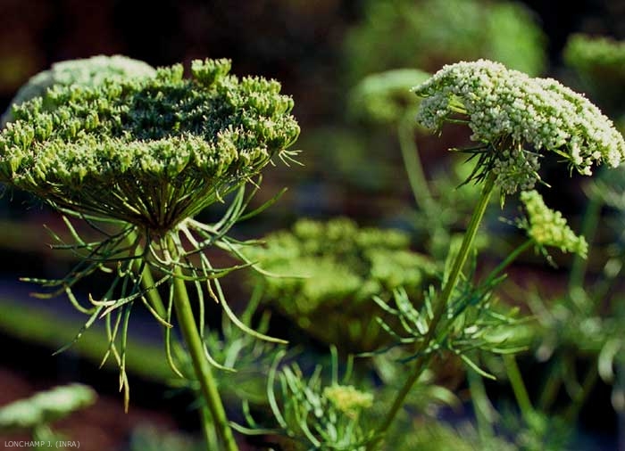 Fleurs blanches en ombelles à rayons très nombreux (jusqu'à 150) et raides avec des pétales échancrées ; involucre à bractées pennatiséquées une ou deux fois, avec des lanières filiformes