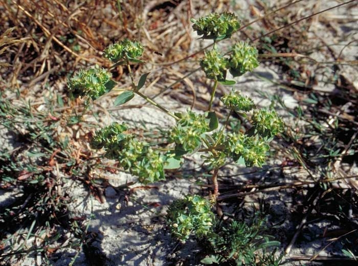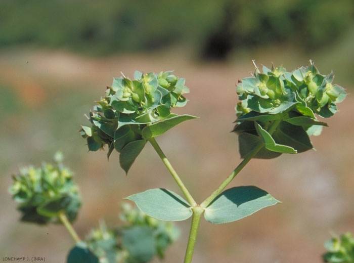 Fleurs jaune-vert à glande jaune en croissant, disposées en ombelles terminales de 3 à 5 rayons accompagnées de nombreux rameaux florifères axillaires. Bractées ovales, mucronées
