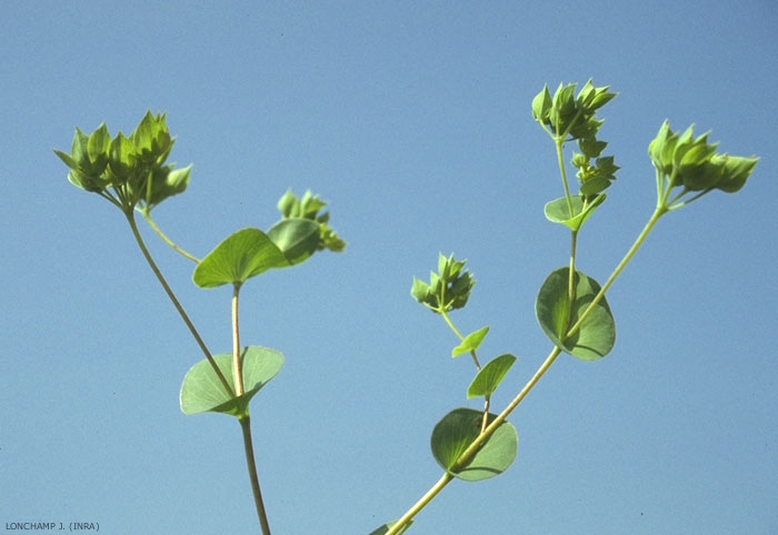 Feuilles indivises, arrondies à ovales, entourées d'une bordure transparente. Feuilles perfoliées, traversées par la tige à nervures principales rayonnantes