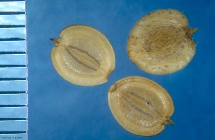 Ornementation : akène couvert de poils avec 2 bandelettes visibles uniquement sur la face commissurale (interne) ;