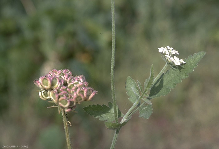Fleurs blanches à pétales inégaux en ombelle, un pétale plus grand que les 4 autres. Ombelles de 5 à 10 rayons inégaux couverts de poils raides. Involucre et involucelles à bractées étroites, étalées ;