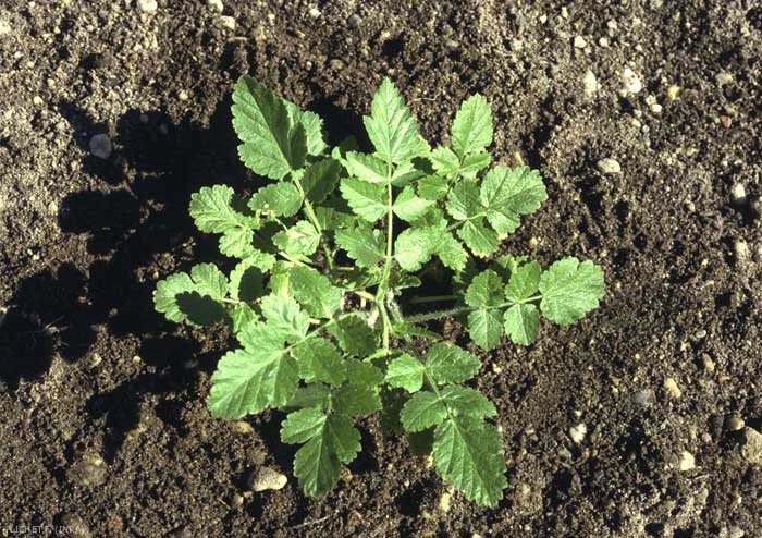 Feuilles inférieures divisées en 5 à 7 segments ovales ou ovales allongés plus ou moins découpés. Feuilles supérieures pennatiséquées à segment terminal bien plus long que large, grossièrement et inégalement denté sur les côtés ;