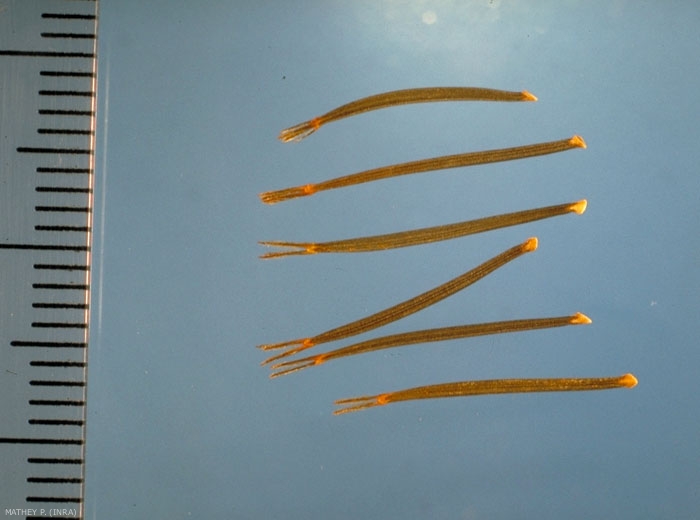 Forme : akènes périphériques fusiformes, de 5-8 mm de long à arêtes très réduites. Akènes centraux fusiformes très allongés de moins de 14 mm, à arêtes de 2-3 mm