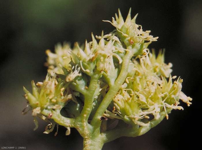 Fleurs jaunes très pâle en corymbe. Inflorescence avec des rameaux tournés vers l'extérieur à la floraison. Fleur à 5-8 sépales et pétales, obtus à leur sommet, pétales 3 à 4 fois plus longs que les sépales. Filets des étamines avec à la base des poils translucides ;