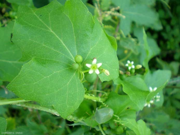Fleurs verdâtres, veinées, en fascicules axillaires (plante dioïque). Fleurs mâles plus grandes et bien plus longuement pédonculées que les fleurs femelles. Sépales triangulaires (figures 4 et 5)