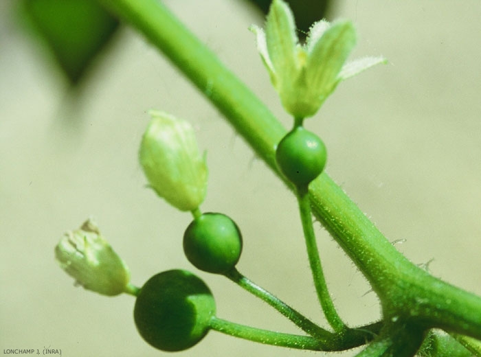 Fruits : petites baies (5 à 8 mm de diamètre), dressées, globuleuses, lisses, rouges à maturité, à suc fétide. 4 à 6 graines elliptiques (figure 6).