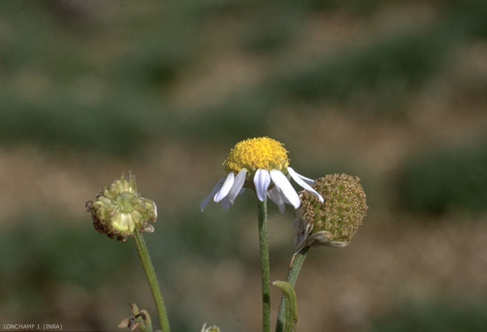 Fleurs blanches périphériques ligulées (de 6 à 12 mm). Fleurs jaunes centrales tubulées. Capitules avec de nombreuses paillettes effilées persistant jusqu'à la fructification