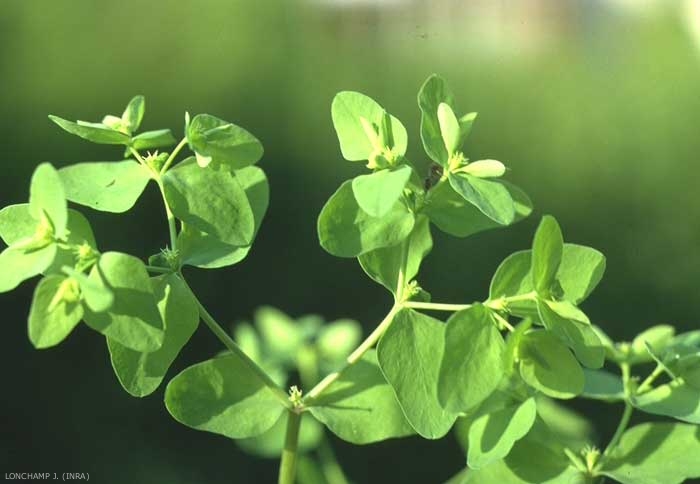 Fleurs jaune-vert, peu voyantes en ombelle terminales parfois accompagnées d'un ou plusieurs rameaux florifères latéraux axillaires. Bractées ovales, mucronées. Glandes en croissant