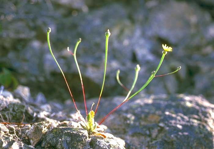 Feuilles : disposées en rosette, obovales, entières à légèrement dentées, bord ciliés, face inférieure velue.