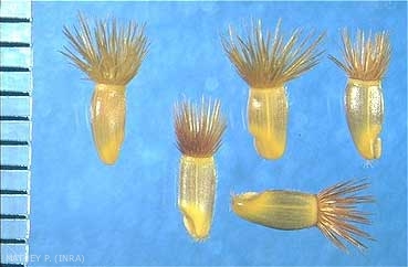 Forme : conoïde, ovoïde à ellipsoïde aplanie, à base arrondie avec ombilic hilaire décentré. Aigrette à soies non plumeuses persistantes, rousses, longues des 3/4 de l'akène