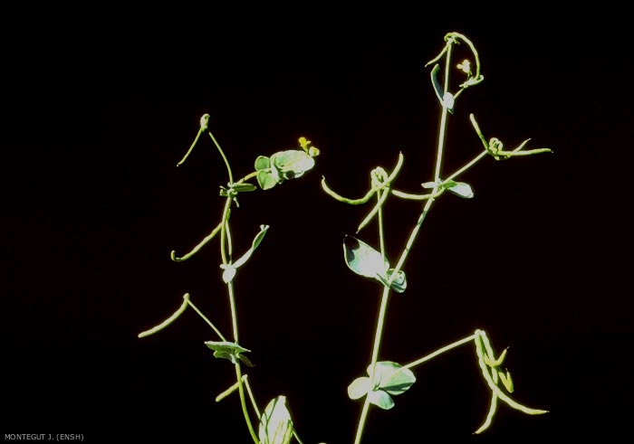 Fruits : gousses devenant pendantes ou étalées, 3 à 4 cm, 6 angles obtus, très arquées, noueuses, striées.