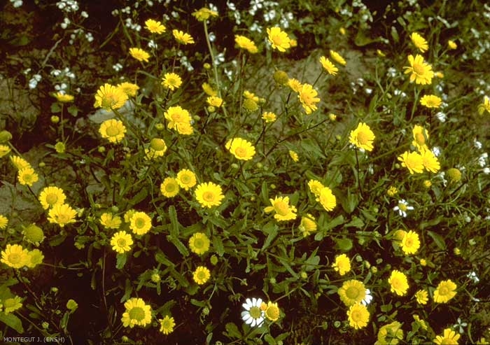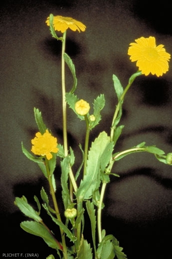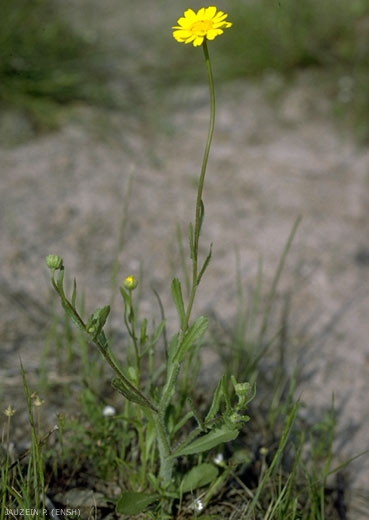 Fleurs jaunes en capitule de 2 types : les fleurs du centre constituées d'un tube très aplati et terminées par 4 ou 5 dents et les fleurs du pourtour ligulées. Bractées de l'involucre presque complètement membraneuses