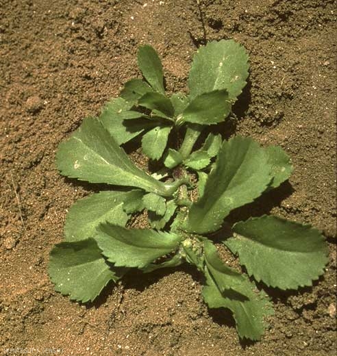 Feuilles inférieures, obovales, spatulées, limbe atténué en pétiole. Feuilles moyennes obtuses, dentées, sessiles, demi-embrassante