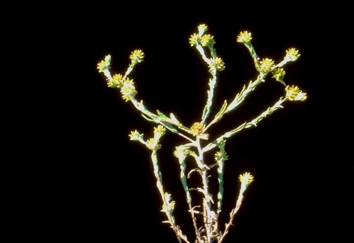 Fleurs jaune-pâle en capitules sphériques, groupés en glomérules ; glomérules terminaux ou sur les fourches. Involucre à 5 angles peu saillants. Bractées de l'involucre à pointe pourpre