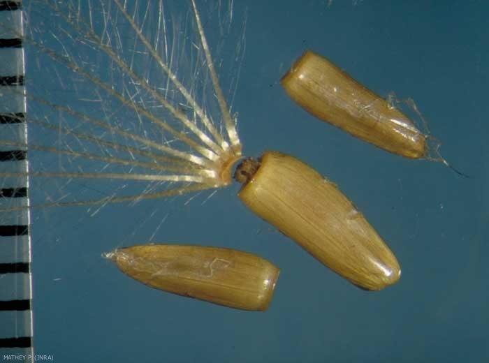 Ornementation : paroi à stries orangées, akènes luisants et sans poils