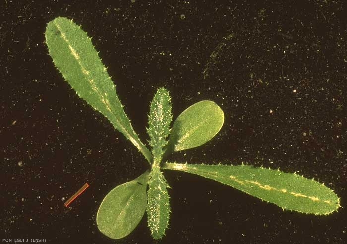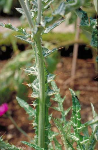 Feuilles vertes irrégulièrement tachées de blanc sur la face supérieure, un peu velues au-dessus et blanches tomenteuses (cotonneuses) en-dessous. Feuilles étroites lancéolées, pennatipartites à divisions lancéolées aiguës et épineuses