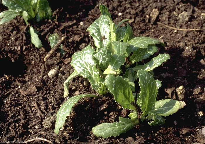 Feuilles ordinairement marbrées de blanc au dessus, les caulinaires sessiles, non décurrentes, embrassant la tige par 2 larges oreillettes arrondies sinuées-dentées, ou pennatifides à lobes bordés d'épines et de cils épineux ;