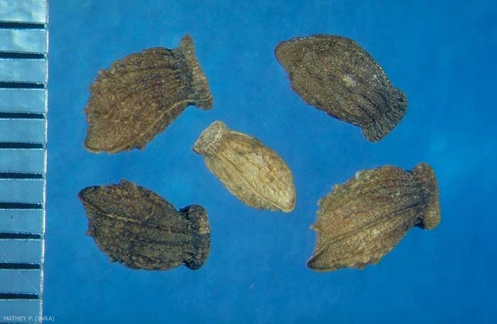Forme : semence +/- ovoïde, anguleuse, à base aplanie ; une face convexe, l'autre diédrique. Hile hypertrophié à l'intérieur d'un bourrelet à contour arrondi