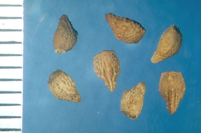 Fruits de plus en plus distants à maturité. Les akènes sont brunâtres, rugueux, couverts de petits tubercules ou de saillies en réseau, à 4 parties aiguës vers leur sommet.