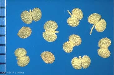 La semence est généralement formée par le fruit fortement indéhiscent à 2 loges. Fruit plus large que long, en coeur, portant un pédicule filiforme.