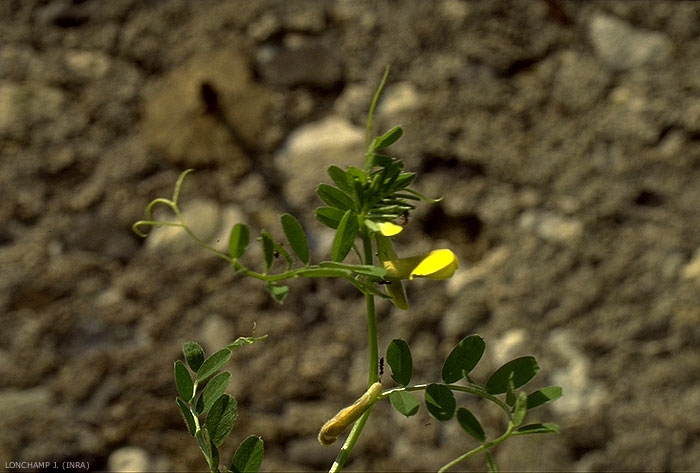 Fleurs jaunes à étendard souvent jaune ou rose, solitaires ou quelquefois groupées par 2 à 3 sur des pédoncules très courts ; calice à dents inégales, dent inférieure plus longue que le tube du calice ;