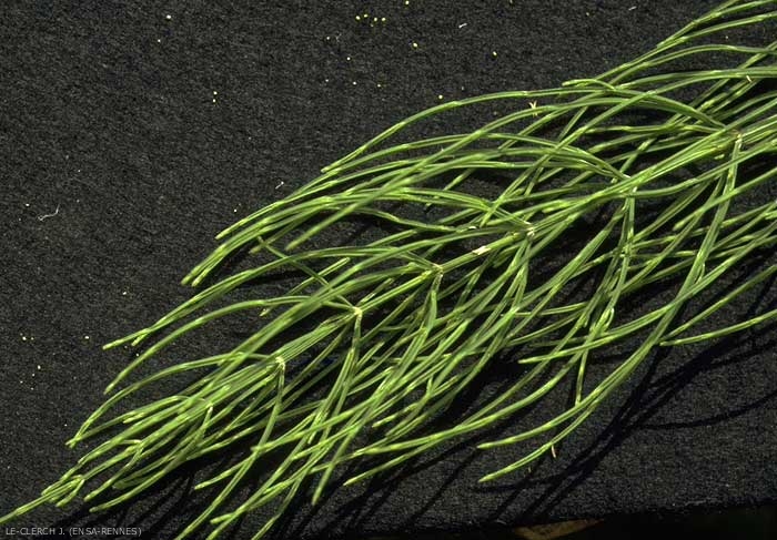 Tiges stériles de 20 à 80 cm, vert pâle, à sillons profonds, verticilles de rameaux grêles à 4 angles aigus. Gaine verte à dents noires
