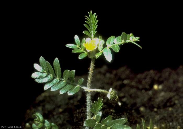 Fleurs jaunes petites isolées, portées par des pédoncules peu allongés à l'aisselle des feuilles ou aux bifurcations de la tige ; 5 sépales ovales, 5 pétales de moitié plus longs que les sépales. 10 étamines et 1 style très court