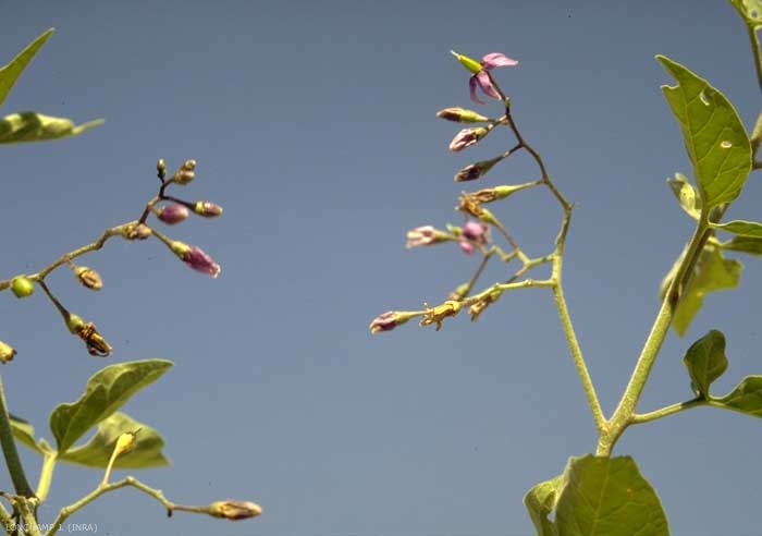 Fleurs violettes ou blanches, grandes, en cymes en forme d'ombelle, divariquées, multiflores, longuement pédonculées ; calice vert, petit à lobes courts ; corolle à lobes réfléchis marqués chacun vers la base de 2 taches vertes ; anthères jaunes ;