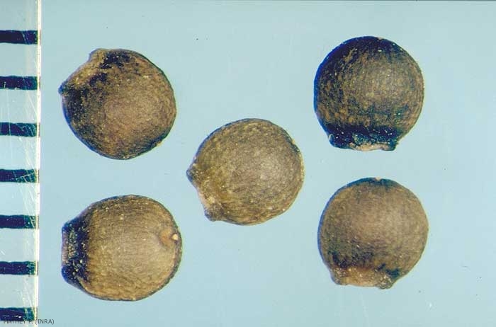 Forme : globuleuse avec hile important déformant la forme générale sphérique de la semence. Fossette hilaire elliptique et légèrement ourlée. Sommet arrondi