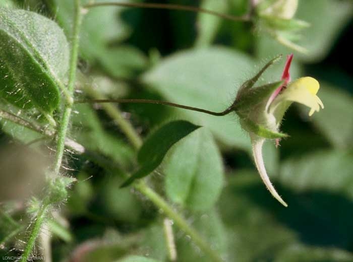 Fleurs jaune-clair, (8 à 11 mm) solitaires, à l'aisselle des feuilles. Lèvre supérieure violette, lèvre inférieure jaune foncé. Fleur à éperon droit. Pédoncule beaucoup plus long que le calice, et glabre. Calice velu à lobes lancéolés