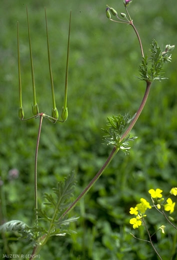 Fruit à valves marquées de 2 à 4 plis concentriques, bec long de 8 à 10 cm.
