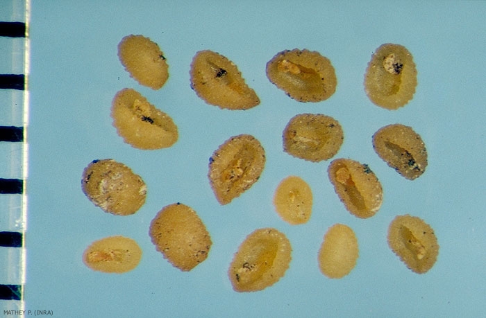 Forme : semence ovoïde, globuleuse, aplatie en bouclier, à marge enroulée vers la face inférieure. Face inférieure creusée avec hile proéminent ;