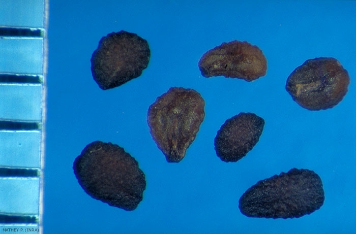 Forme : semence globuleuse ellipsoïde à ovoïde munie d'un bord ridé, festonné ;