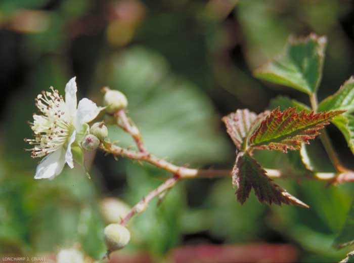 Feuilles grandes à 3 à 5 folioles grossièrement dentées, stipules soudées au pétiole, hérissées, parfois teintées de rouge brun