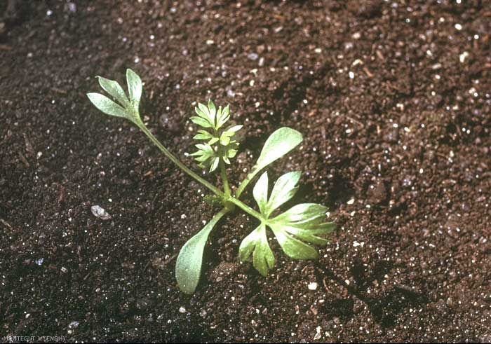 Feuilles multifides divisées en lanières étroites aiguës. Lanières moins étroites dans les feuilles de la base de la tige ;