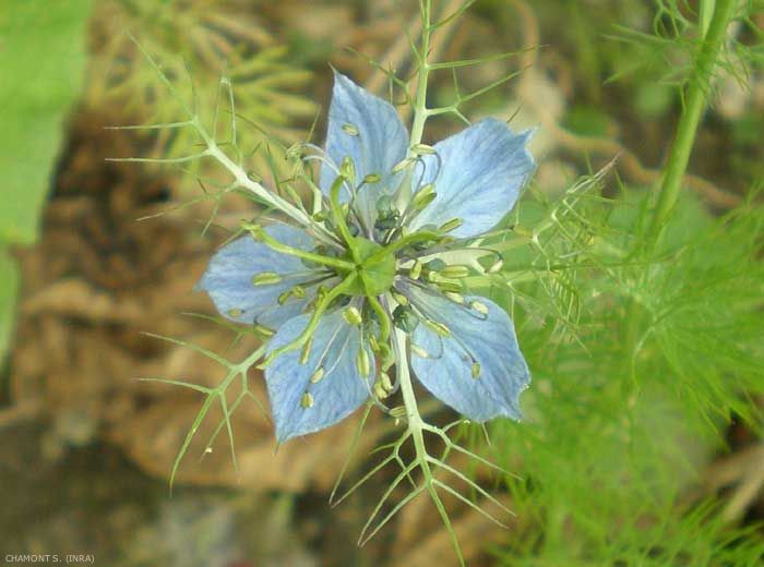 Fleurs bleu pâle (sépales), entourées par les longues et minces lanières vertes de l'involucre bien plus longues que les sépales. Involucre semblable aux feuilles qui entourent la fleur. Pétales réduits à un nectaire ;
