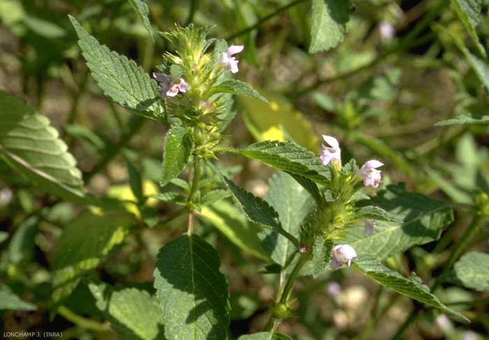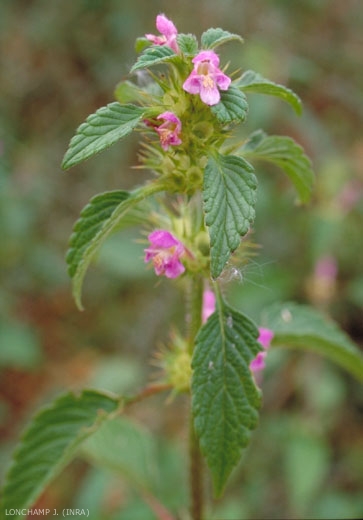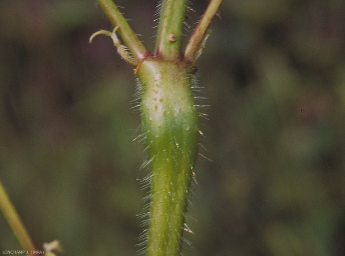 Tige pubescente quadrangulaire. Renflements de la tige juste sous les noeuds et poils raides, rêches au toucher, dirigés vers le bas