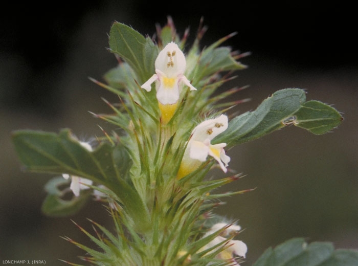 Fleurs purpurines ou blanches, tachées de jaune, petites, en faux verticilles pluriflores à l'aisselle des feuilles. Calice campanulé à dents épineuses. Tube blanc, de 14 à 22 mm de long. Lèvre supérieure dressée en casque, lèvre inférieure trilobée avec un lobe médian entier