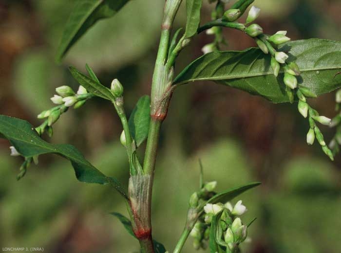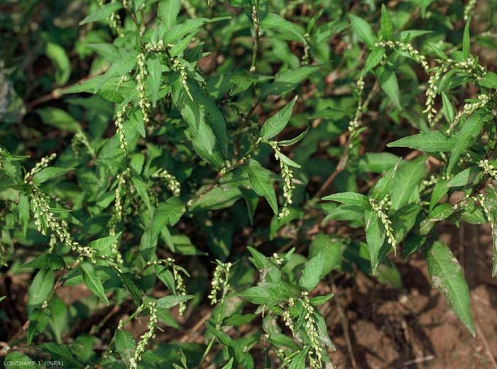 Feuilles lancéolées allongées, assez régulièrement amenuisées vers la base et le sommet, ponctuées régulièrement de points noirs, à goût poivré. Nervures saillantes, translucides et ponctuées, glandulaires. Ochréas presque glabres, munies de longs cils ;