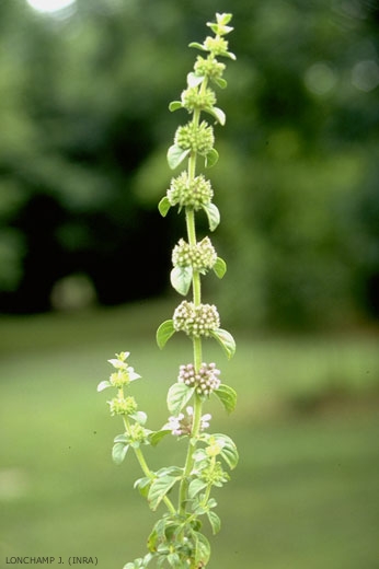 Fleurs violettes ou rosées, rarement blanches, petites, en glomérule. Calice velu à 5 dents non égales, presque bilabié. Corolle à lobes presque égaux, légèrement bossue d'un côté ;