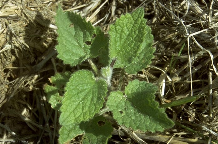Feuilles inférieures disposées en rosette. Feuilles suivantes opposées, pétiolées, ovales obtuses, tronquées ou un peu en coeur à la base, régulièrement crénelées ;