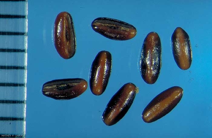 Forme : ellipsoïde linéaire. Semence aplanie en bouclier irrégulier à marge enrouée vers la face inférieure en gouttière linéaire ;