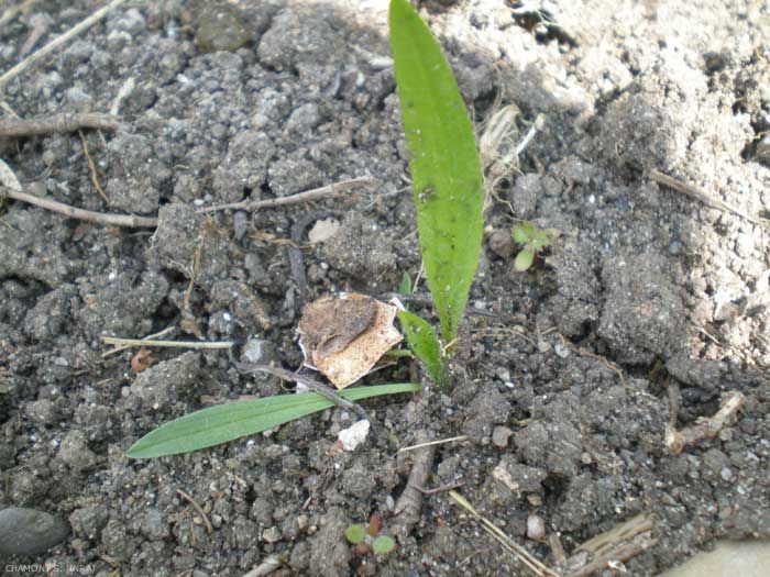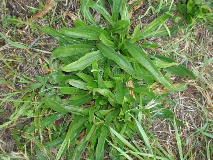Feuilles ovales et allongées en rosette, aiguës au sommet, rétrécies à la base en un pétiole grêle et assez long, dressées, parcourues en long par 3 à 5 nervures principales ;