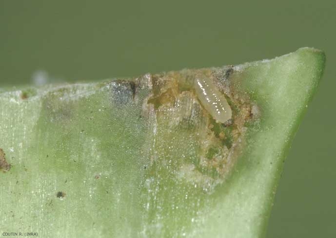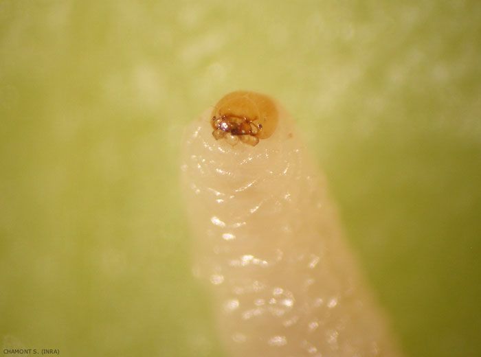 La larve de dernier stade mesure entre 4,5 et 6,5 mm de long. Elle est apode, blanche, avec une capsule céphalique noire au début de son développement qui devient jaunâtre en fin de maturité (figures 2 et 4).
