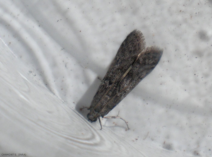 L'adulte a une envergure de 20-22 mm avec des ailes antérieures grises avec des motifs noirs. Les ailes postérieures sont frangées (figures 1 et 2).