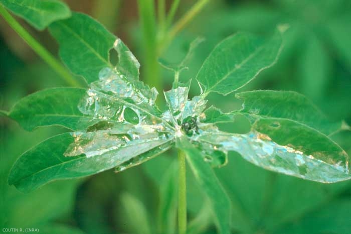 Sur les feuilles, elles provoquent des trous au milieu des limbes et des encoches sur les bords, respectant en général les nervures (figures 1 et 2). Les bulbes, les betteraves et les têtes de choux sont creusées d'excavations plus ou moins profondes. La tête des plantules ou le pédoncule de certaines fleurs sont sectionnés.