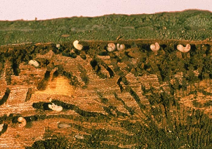 Dans le même temps cette écorce est colonisée par plusieurs espèces de scolytes (figure 1, coléoptères Curculionidae) qui se reproduisent en déposant leurs pontes. Parmi les espèces concernées on trouve entre autre Scolytus multistriatus (Marsham 1802) ou S. scolytus (Fabricius 1775). Lors de leur émergence, les jeunes adultes couverts de ces spores pratiquent, pour se nourrir, des morsures dans les tissus des arbres sains à proximité. Il a également été mis en évidence la présence dans les intestins et les téguments de ces insectes de spores de ce champignon. De plus, les morsures favorisent la pénétration du champignon dans le xylème qui est la zone de l'arbre la plus propice pour une nouvelle infection.