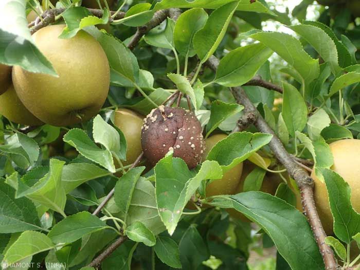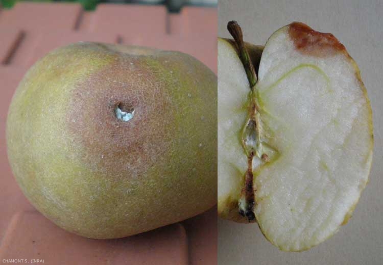 En conservation, les principaux dégâts sont dus à Penicillium expansum, agent de pourriture, donnant au fruit un goût terreux près des zones atteintes par le champignon (figure 3).