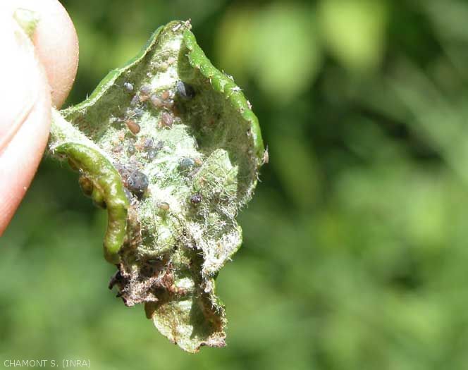 La tordeuse rouge des bourgeons (Spilonota occellana), le puceron vert migrant du pommier (Rhopalosiphum insertum) et le puceron vert non migrant du pommier (Aphis pomi) attaquent les feuilles. La sésie du pommier (Synanthedon myopaeformis) creuse le bois.